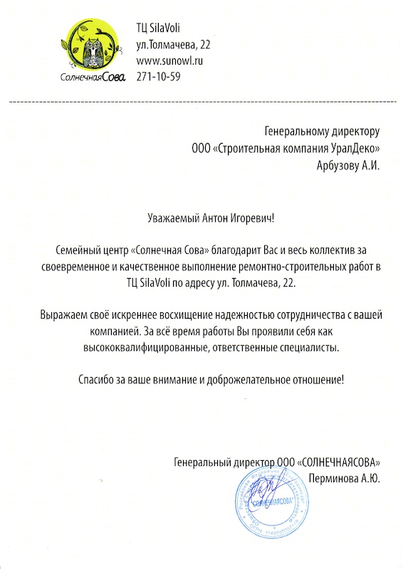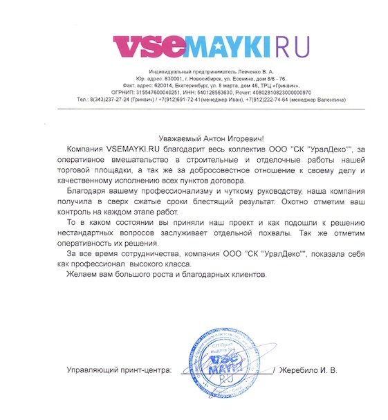 "УралДеко" очень дорожит своей репутацией и поэтому подходит к решению любой задачи очень ответственно и скрупулезно. Для нас нет мелочей. Все важно. Все имеет значение. Компания постоянно совершенствует качество сервиса и расширяет спектр оказываемых услуг. Наши клиенты всегда довольны выполненной работой. Об этом говорят отзывы заказчиков. Некоторые из них мы представили в этом Блоге - благодарственные письма от компаний "Евродом", "Все майки ру", "Солнечная сова"... С остальными вы можете ознакомиться на этой странице.