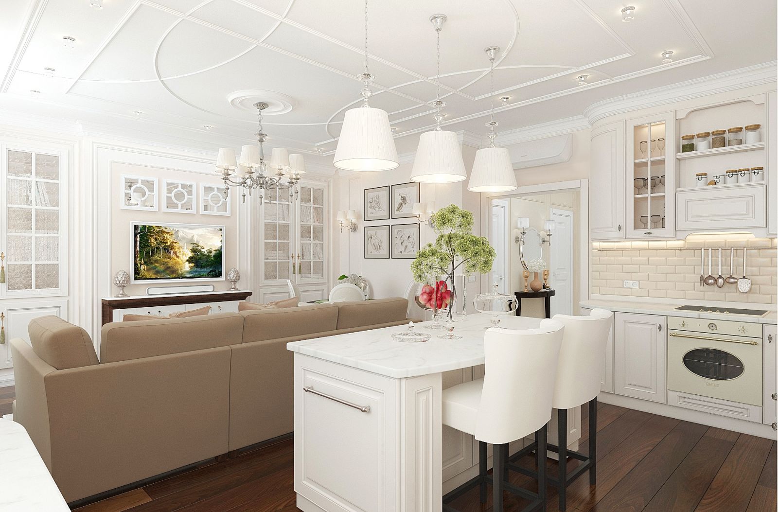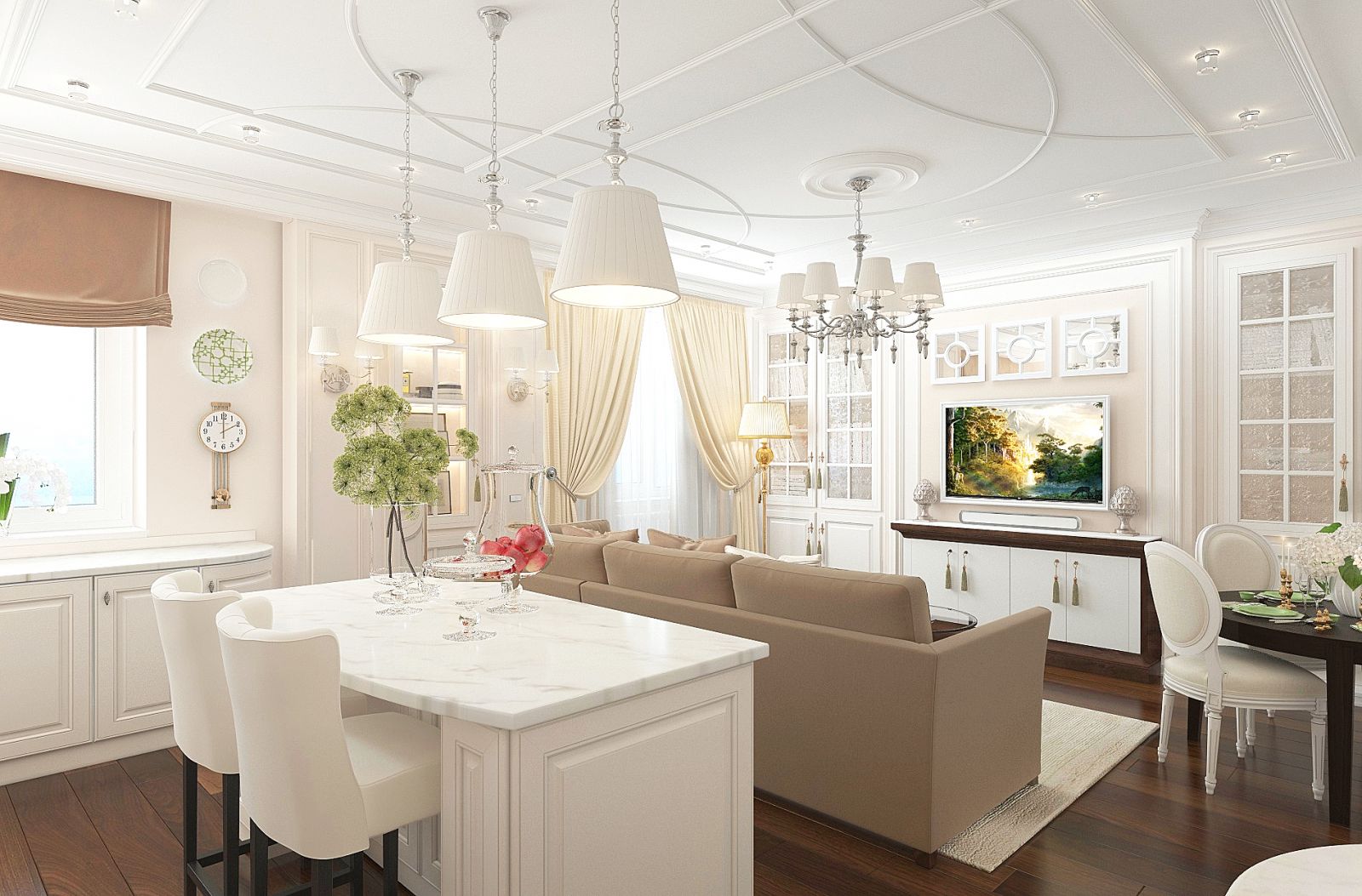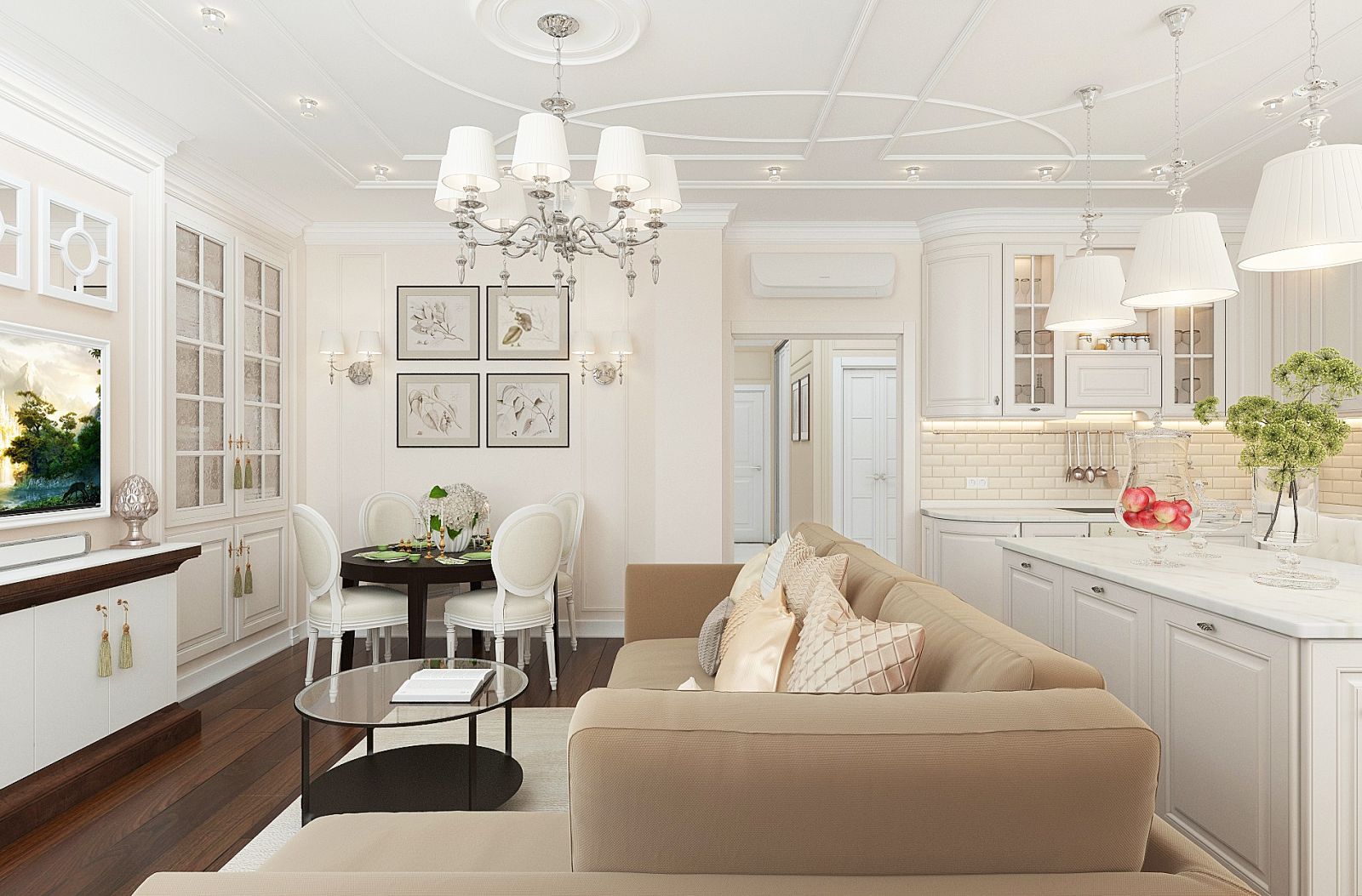 На днях компания "УралДеко" приступила к созданию дизайн-проекта трехкомнатной квартиры в ЖК "Крылов". И вот уже готовы первые эскизы гостиной-кухни. Создавая проект, дизайнер учитывал как стилистические предпочтения хозяйки, так и её пожелания о том, чтобы интерьер квартиры соответсвовал основам фен-шуй. Согласно данному учению, помещение оказалось расположено в зоне "земли", следовательно, спектр цветов ограничился бежевыми, кремовыми, коричневыми оттенками.