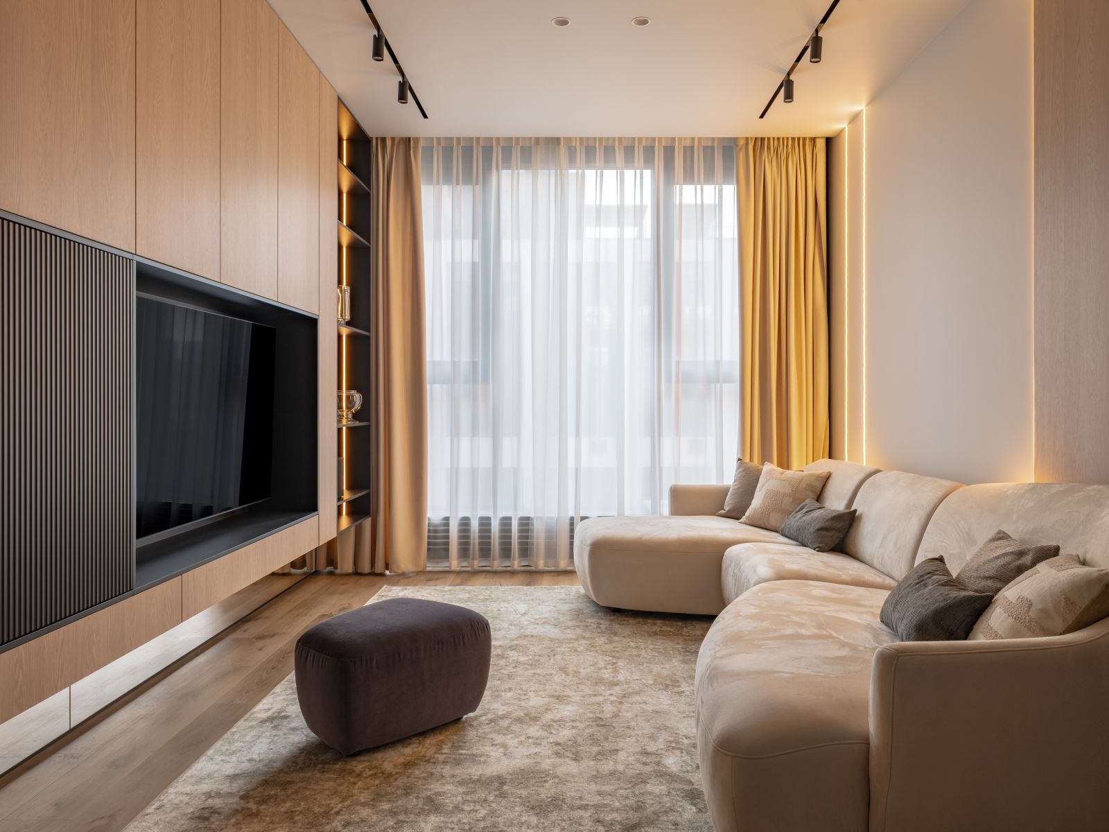 Крупноформатный керамогранит, теневые профили, скрытые двери, сложные сценарии освещения, инженерная доска. Здесь математика другая. Работы сложнее, требования к точности выше, риски больше. В этом сегменте мы видим старт от 99 000 руб./м² и выше за работы с черновкой.