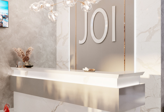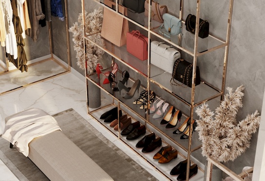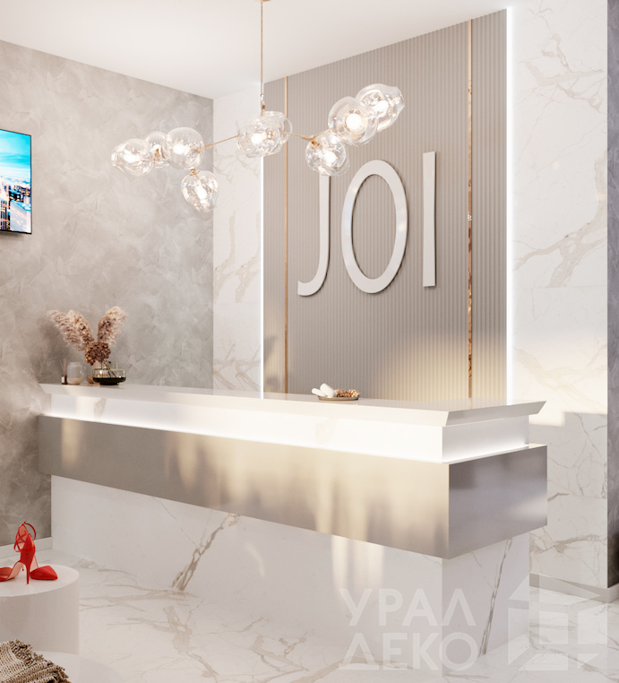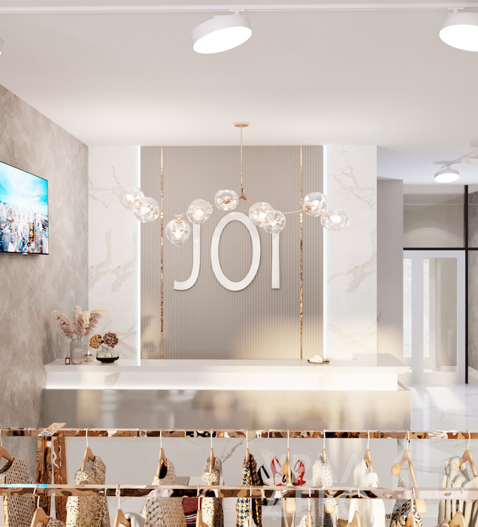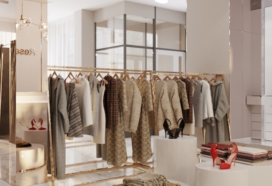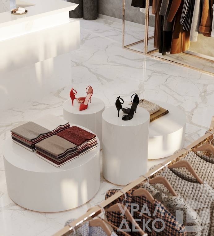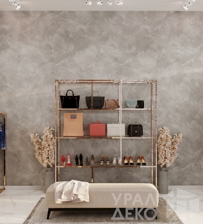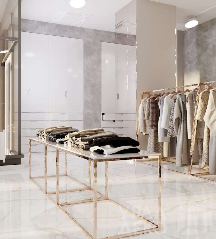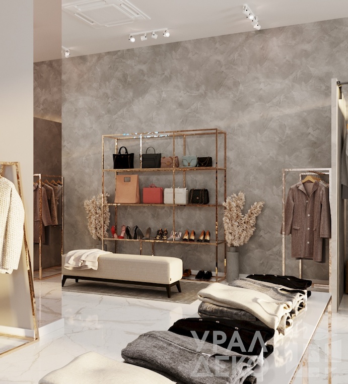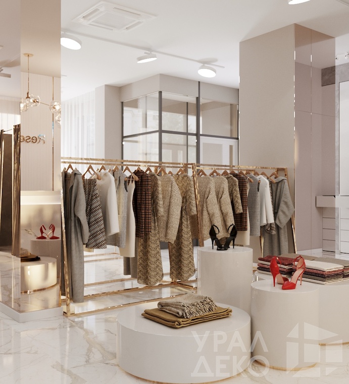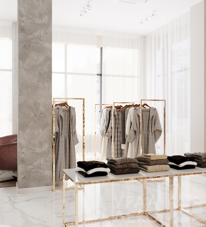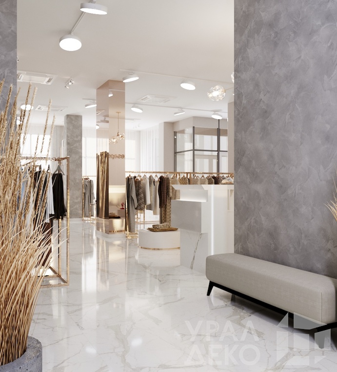 Интерьер магазина одежды в современном стиле. За счет большого количества окон, зеркальных колонн и грамотно разработанной планировки, магазин наполнен светом и пространством. Элегантные декоративные элементы, золотистые напольные вешалки, светлый пол из керамогранита и декоративная штукатурка на стенах - основные элементы данного интерьера. Дизайн магазина одежды получился роскошный, изящный и женственный.