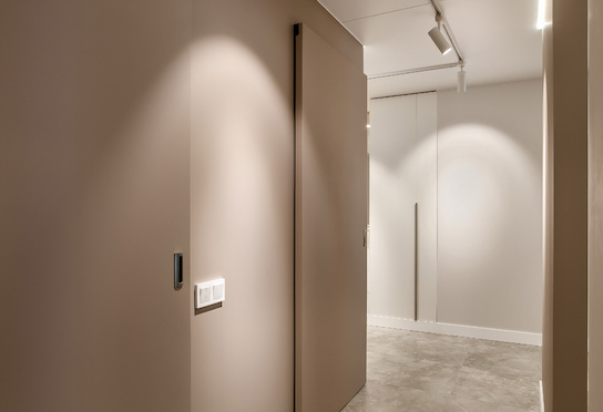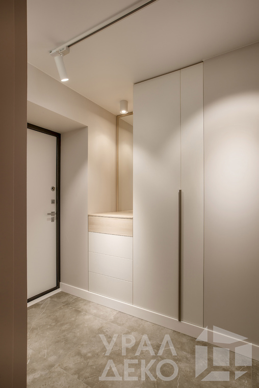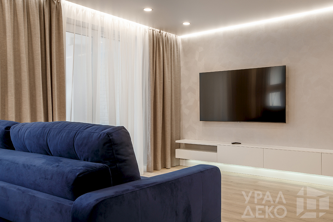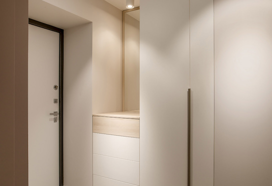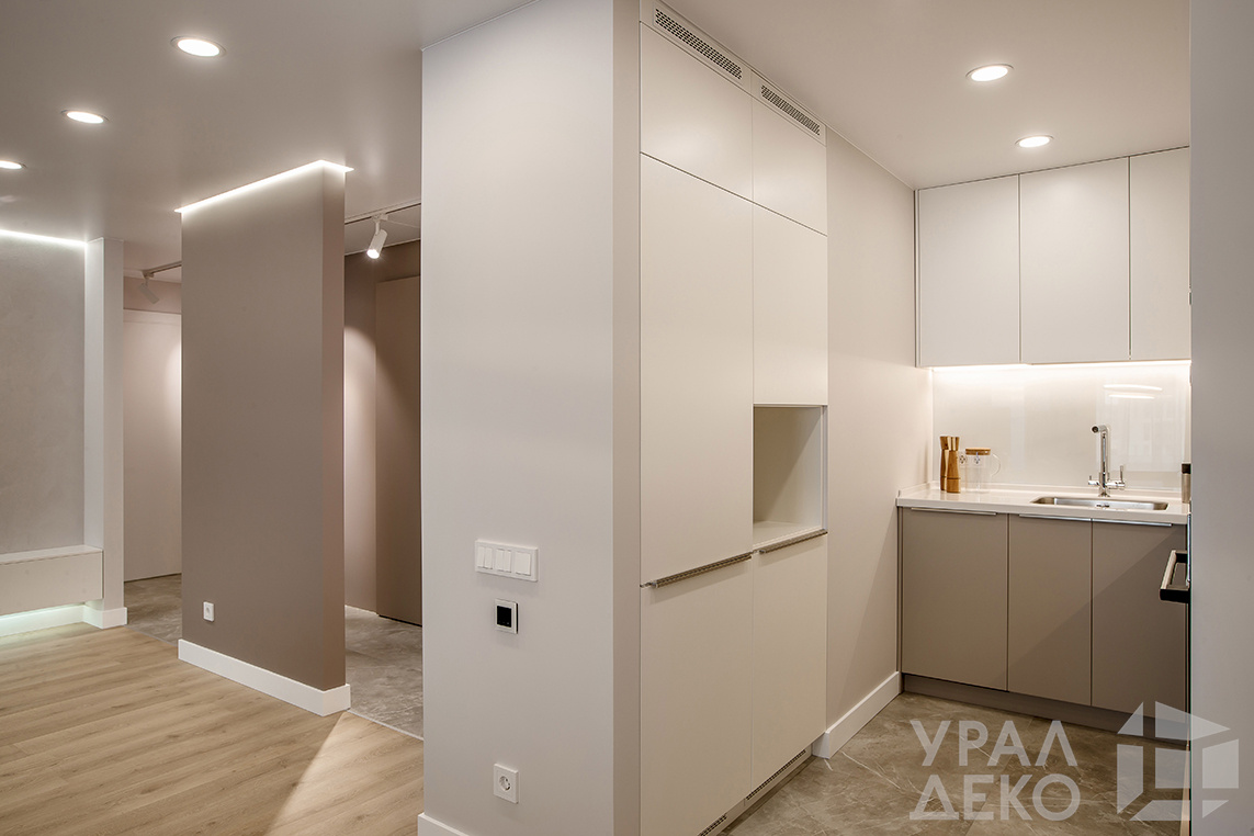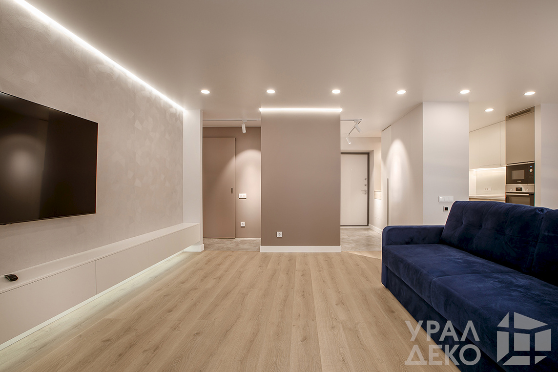 Лаконичный проект двухкомнатной квартиры в современном стиле выполнен преимущественно в однотонной, пастельной цветовой гамме. За счет сложных оттенков, присутствующих в отделке помещений, достигается особый интерес и глубина пространства. Акценты создаются за счет глубоких цветов мебели: темно-синий цвет дивана в гостиной зоне и ярких деталей - бросская картина на стене. В спальне использованы постельные тона, приглушенная подсветка и белый, почти незаметный, шкаф - все это создает спокойную атмосферу, погружающую в отдых и расслабление.