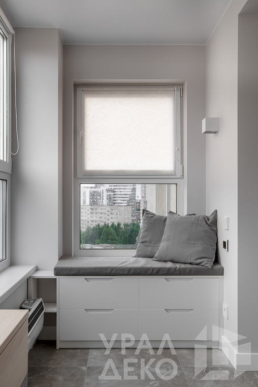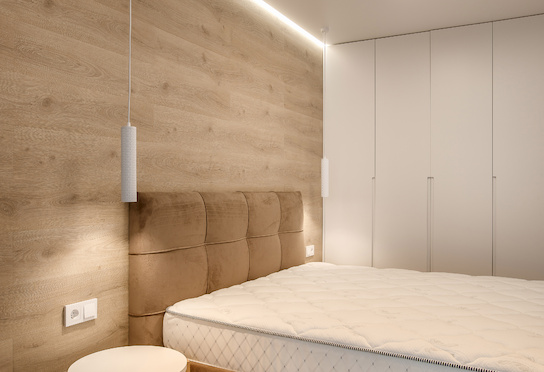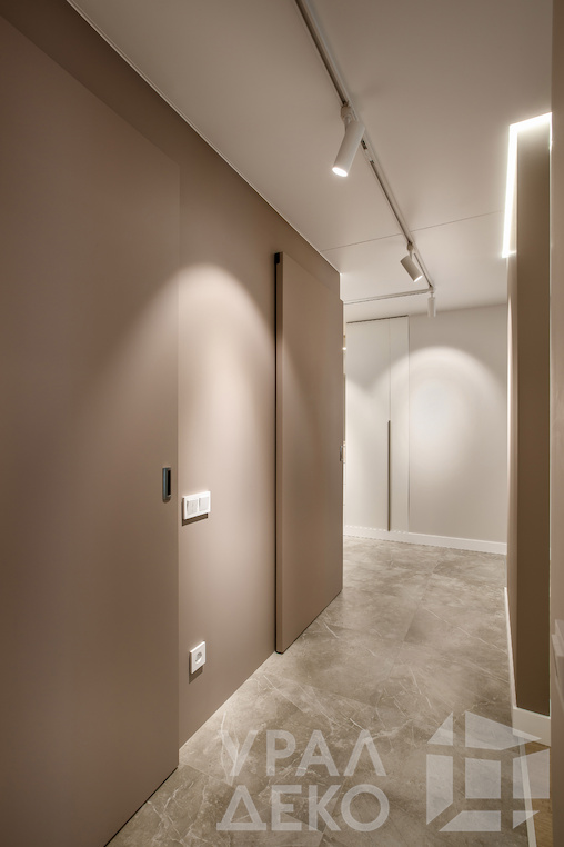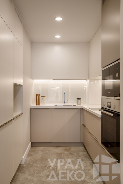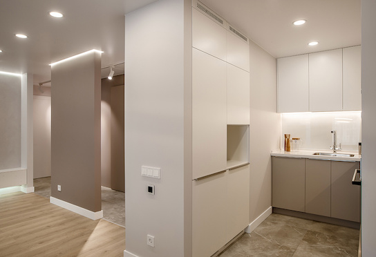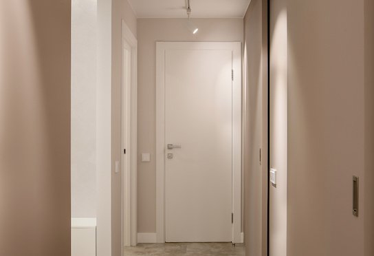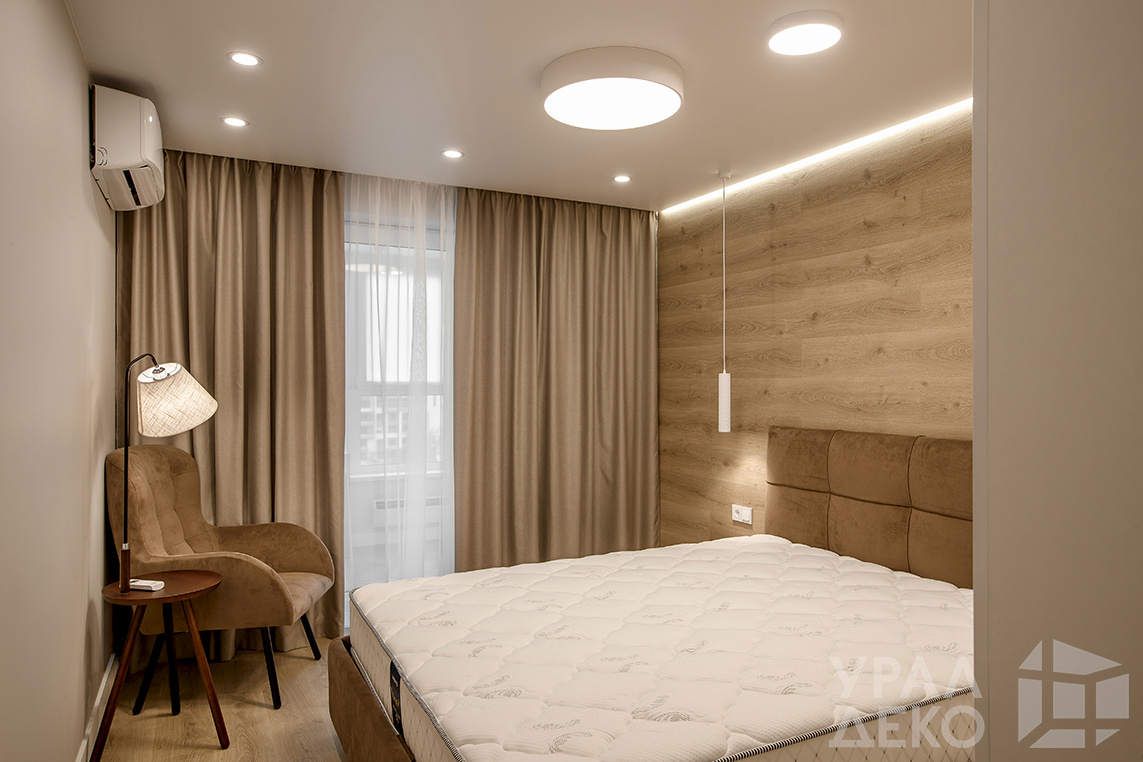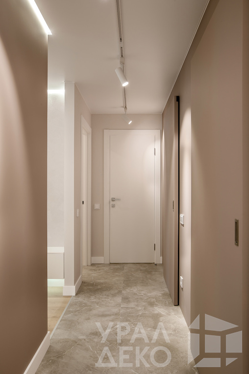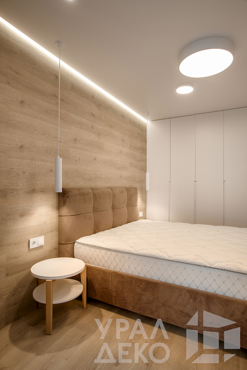 Лаконичный проект двухкомнатной квартиры в современном стиле выполнен преимущественно в однотонной, пастельной цветовой гамме. За счет сложных оттенков, присутствующих в отделке помещений, достигается особый интерес и глубина пространства. Акценты создаются за счет глубоких цветов мебели: темно-синий цвет дивана в гостиной зоне и ярких деталей - бросская картина на стене. В спальне использованы постельные тона, приглушенная подсветка и белый, почти незаметный, шкаф - все это создает спокойную атмосферу, погружающую в отдых и расслабление.