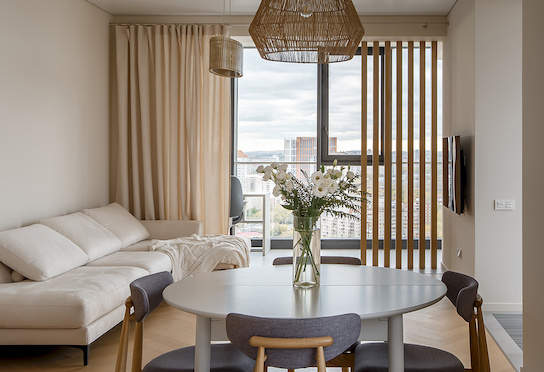 Ремонт трехкомнатной квартиры в ЖК Макаровский квартал - это сочетание разных стилей, тут вы найдёте смесь скандинавского, этно- и экостиля. Натуральные природные материалы, вертикальное озеленение в ванной комнате и на балконе, мебель из натурального дерева делают интерьер по-настоящему неповторимым. Расширенное пространство в гостиной зоне и панорамные окна балкона создают ощущение легкости и наполняют интерьер теплом и светом.