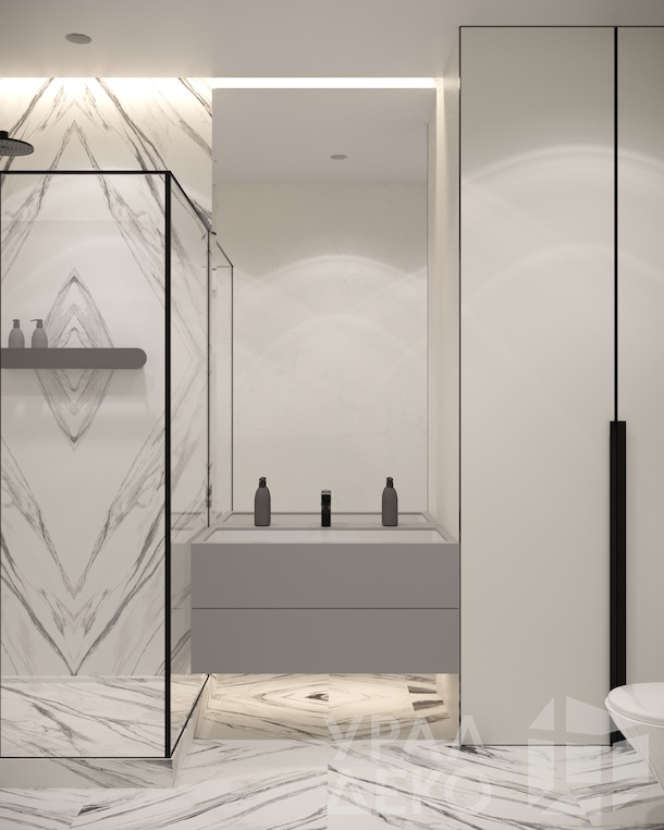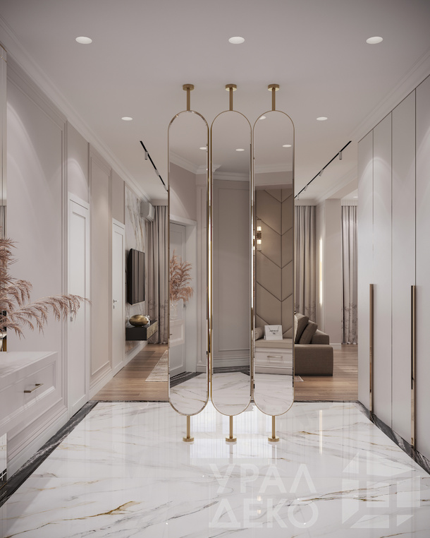 Нежная, утонченная, светлая и гармоничная - такой получилась квартира в ЖК Клевер парк - полное отражение сущности Заказчицы. Легкий классический интерьер преображают вставки крупноформатного керамогранита и необычные осветительные приборы с латунными вставками. Получился дорогой и изысканный интерьер. Интересное решение - разделение необычными зеркалами входную группу с гостиной зоной. Гостевая спальня проекта совершенно выделяется из общего стиля выбором цвета - она выполнена в темных тонах, когда остальной интерьер - в светлых.