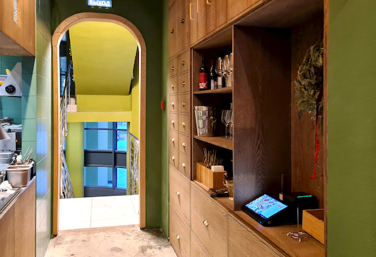 Пространство кофейни «Papa Carlo» в ЖК «Тринити» разделено на 2 зала. На первом этаже расположена кофейня и витрина с десертами. В интерьере преобладают серые оттенки бетона с зеленой акцентной мебелью. Второй уровень выполнен в более домашнем и уютном стиле с открытой кухней. Обилие темно-зеленых оттенков, сочетание дерева и бетона, ковер в центре пространства создают своего рода «оазис», где можно на некоторое время укрыться от непогоды, забыть о проблемах и заботах. Вместо ярких потолочных люстр мы установили подвесные светильники, чтобы создать более приглушенную обстановку. Панорамные окна в пол – изюминка данного помещения, поэтому возле окон располагается мягкая зона, где гости могут любоваться видом на город. Прекрасно дополняют интерьер – живые зеленые цветы, наполняя все помещение спокойствием и безмятежностью.