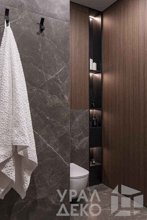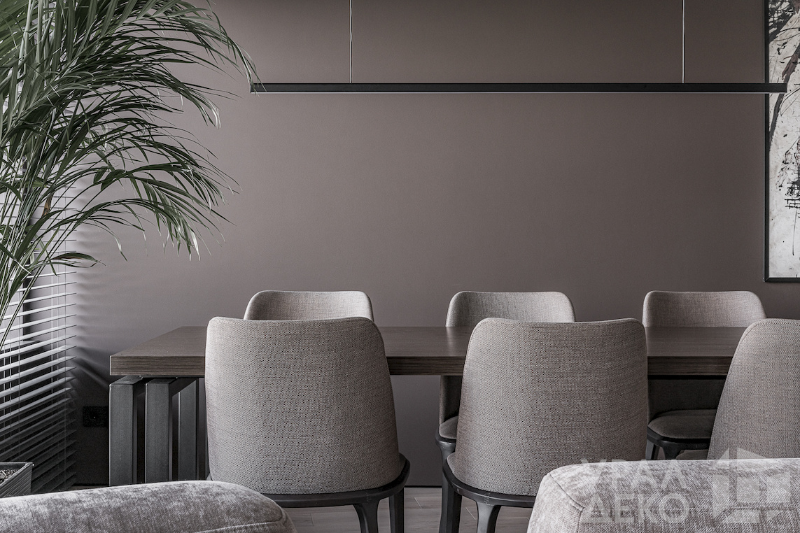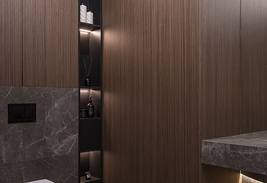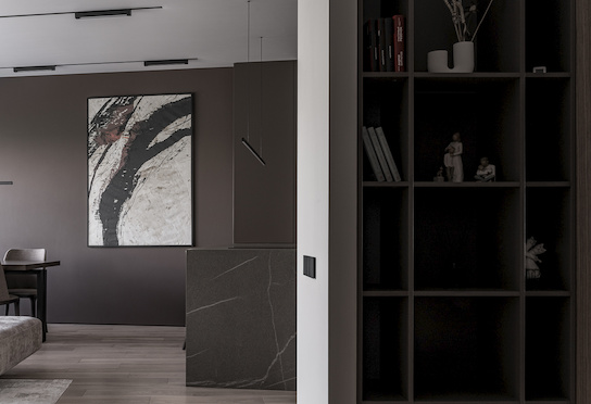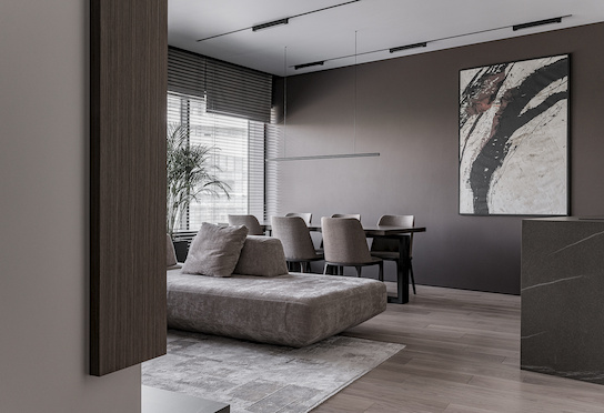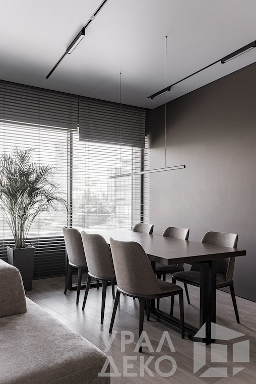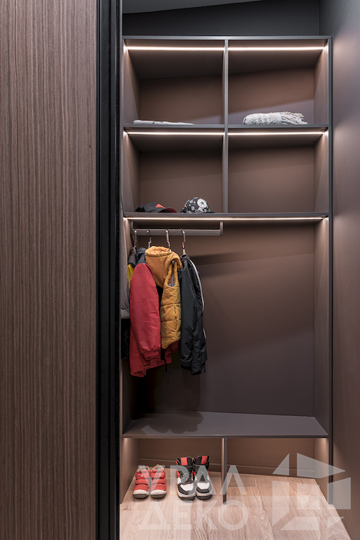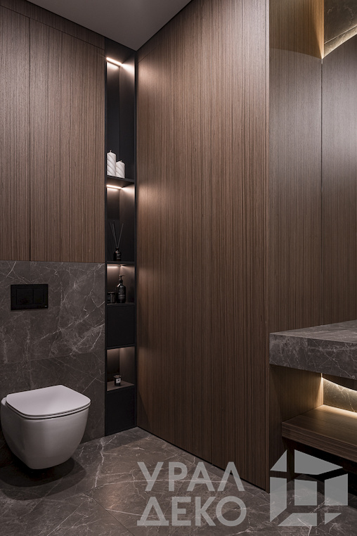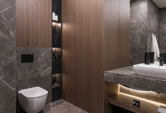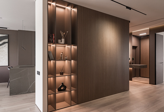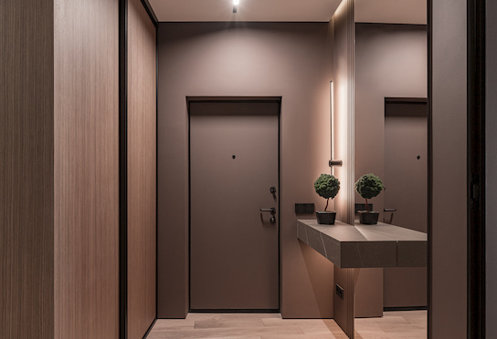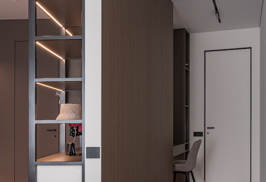 Эстетичный минимализм. Никаких усложнений в дизайне. Лаконично и просто, но при этом достаточно интересно и очень современно. Темные цвета и фактура дерева объединяет пространство. Встраиваемое освещение является тем элементом, который привносит вкус и яркость всему интерьеру.