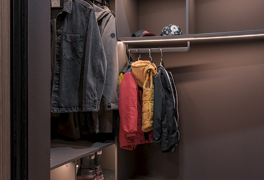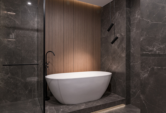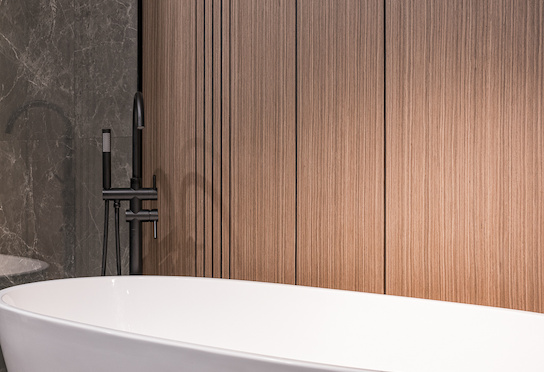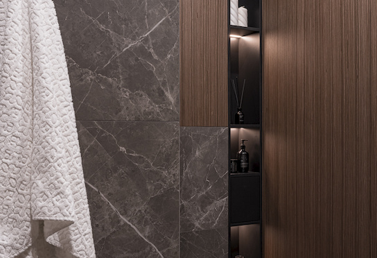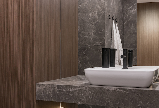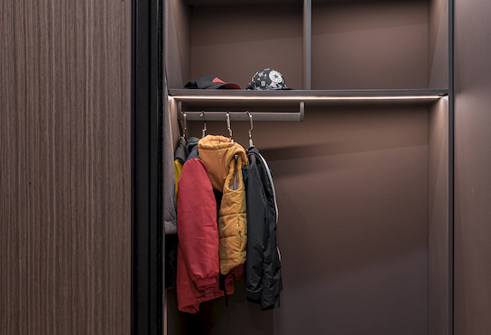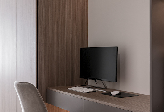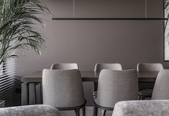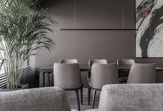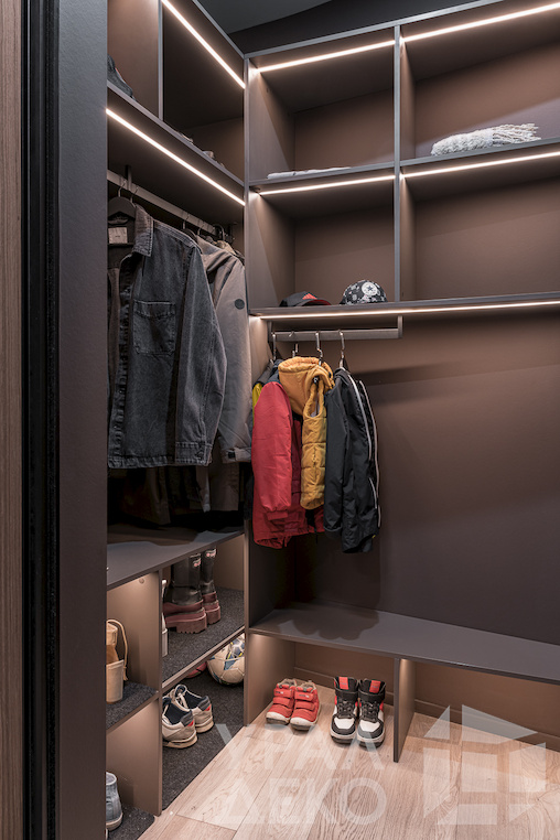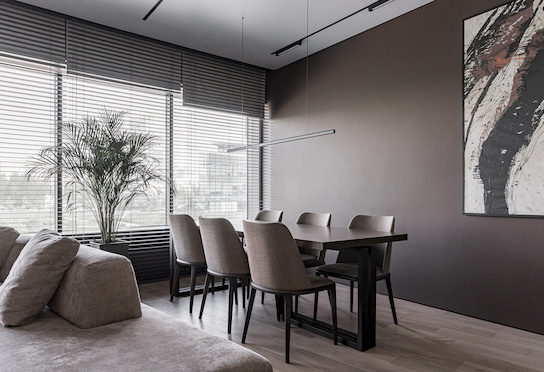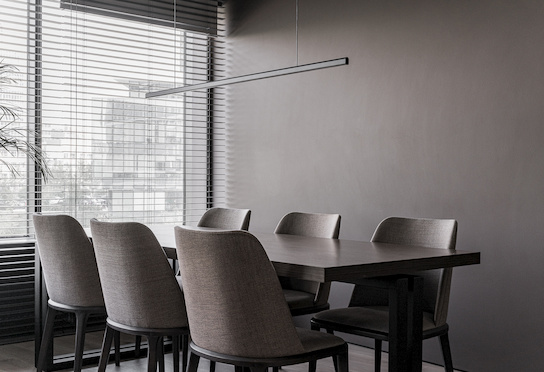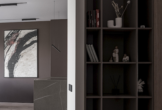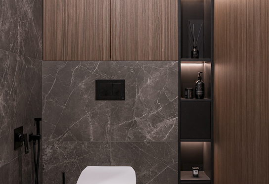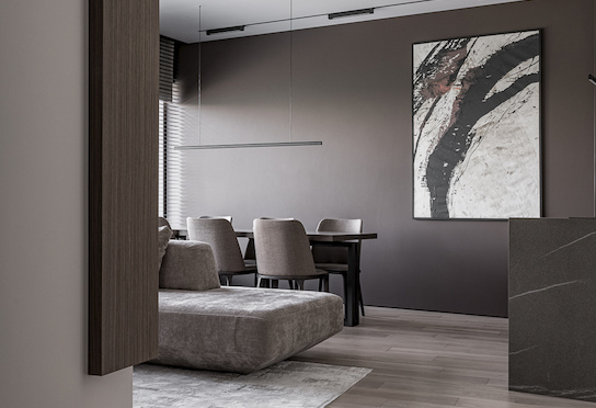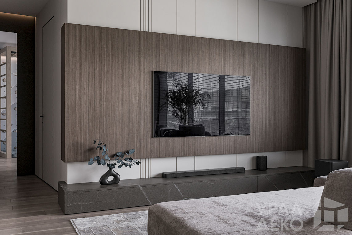 Эстетичный минимализм. Никаких усложнений в дизайне. Лаконично и просто, но при этом достаточно интересно и очень современно. Темные цвета и фактура дерева объединяет пространство. Встраиваемое освещение является тем элементом, который привносит вкус и яркость всему интерьеру.