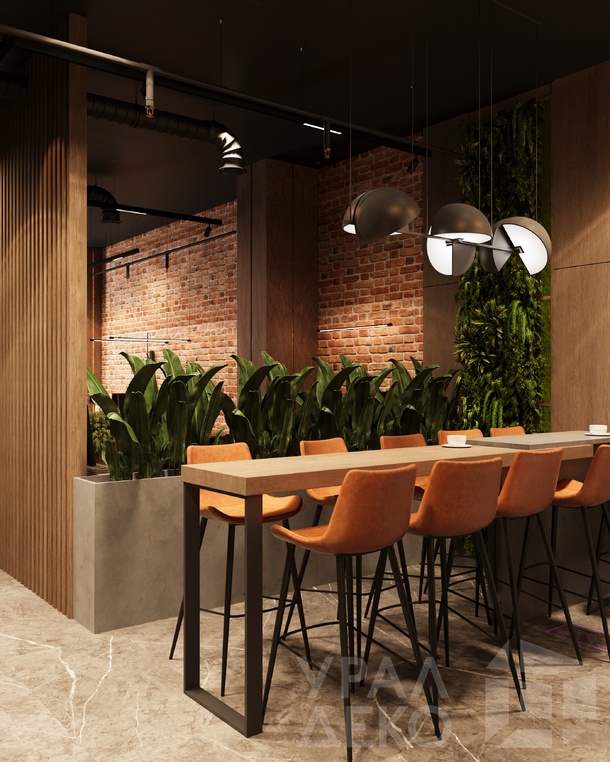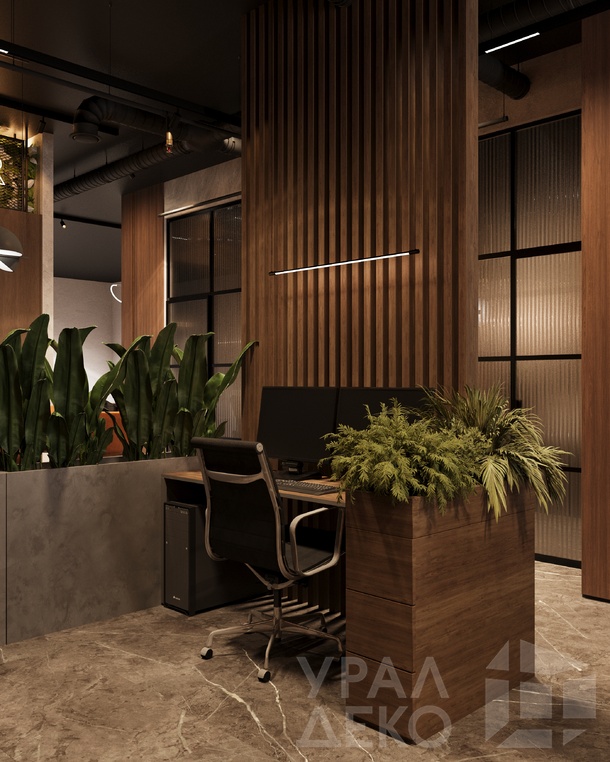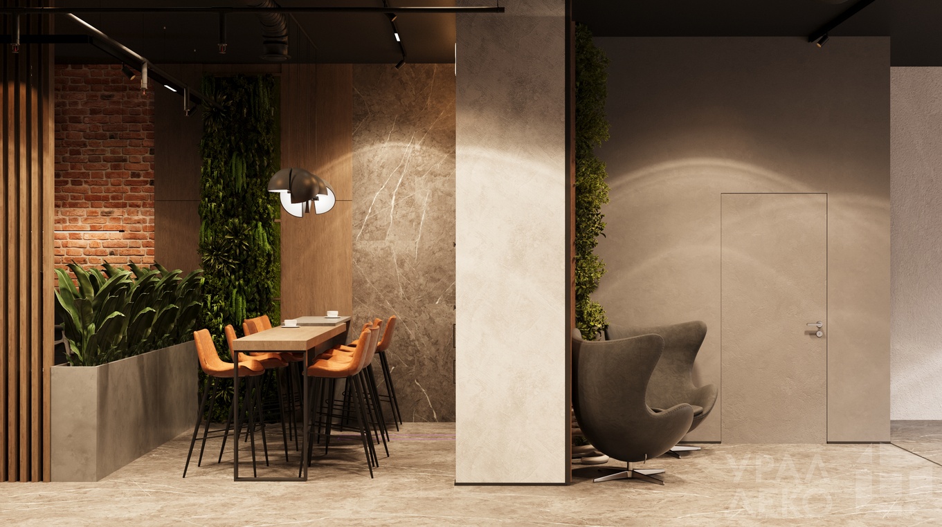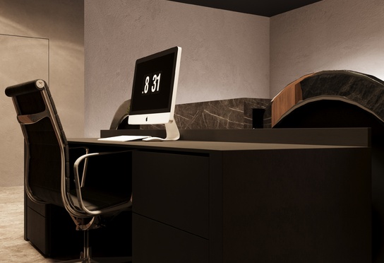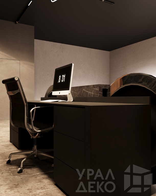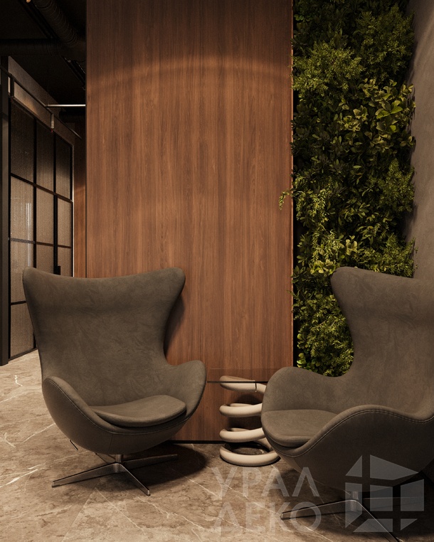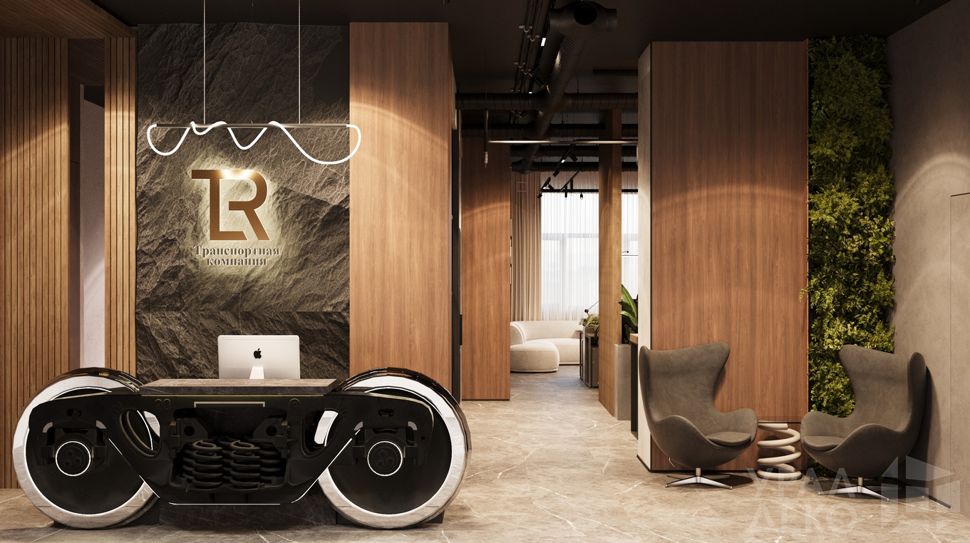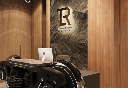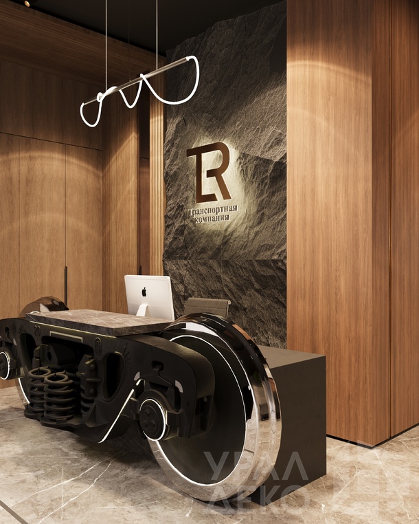 Для зоны рецепции предусмотрена узнаваемая железнодорожная колесная пара и зона ожидания на 2-х посетителей.