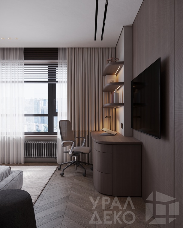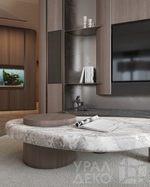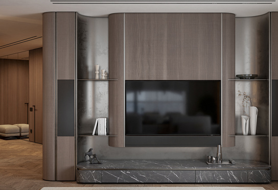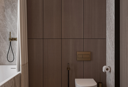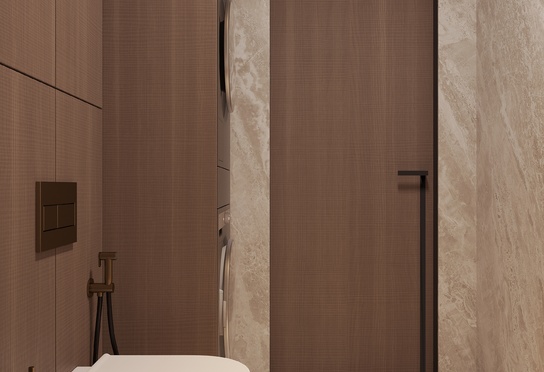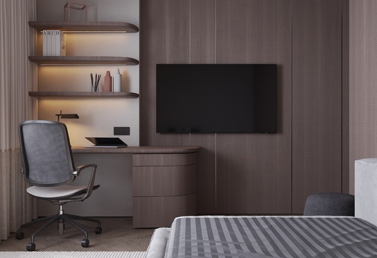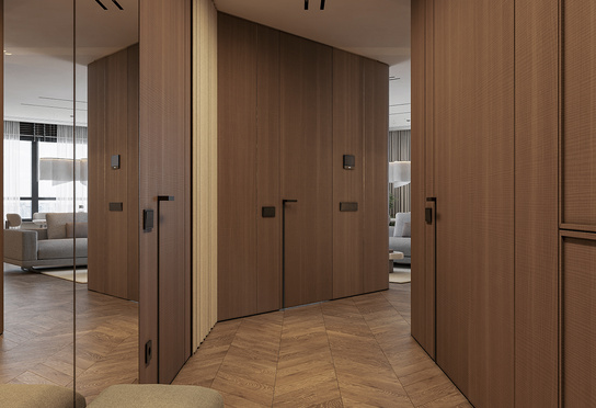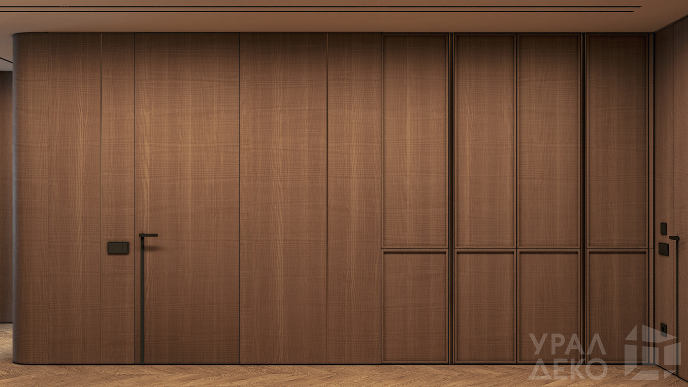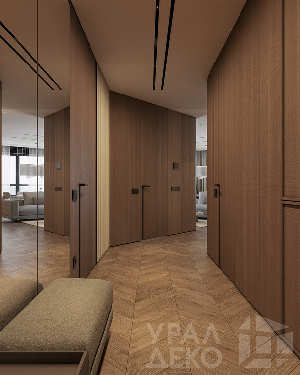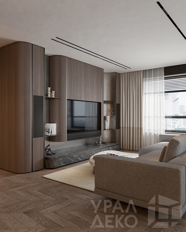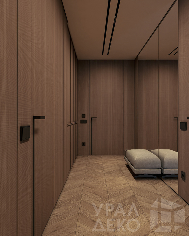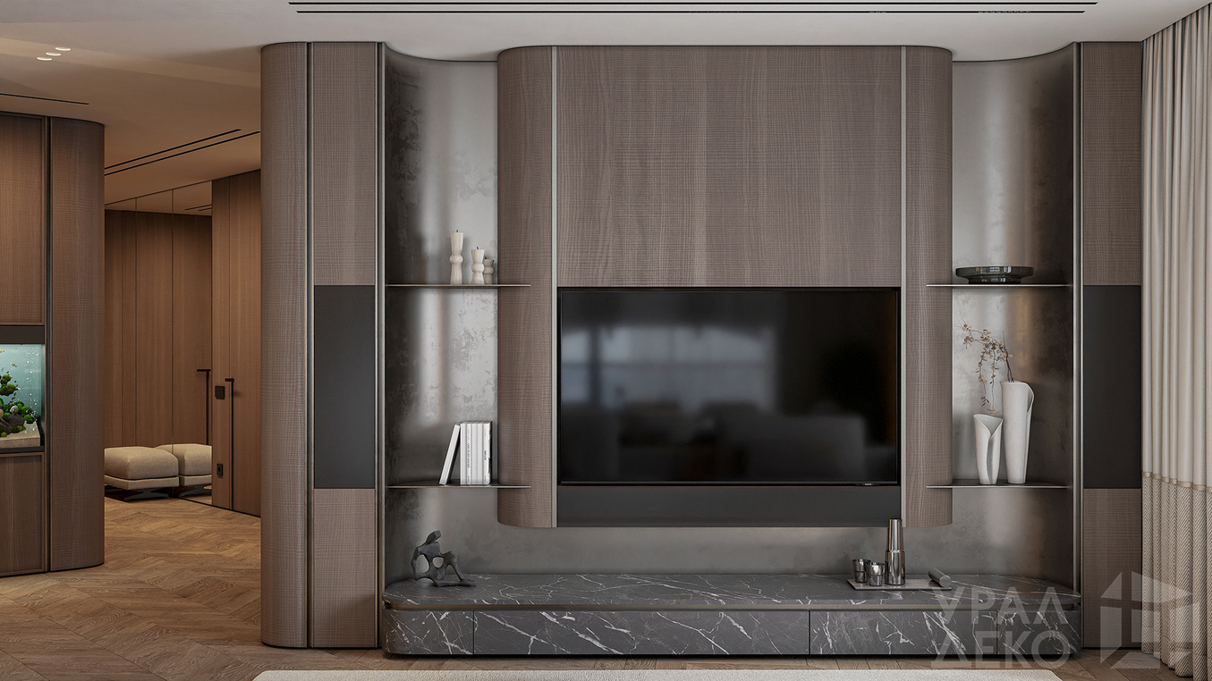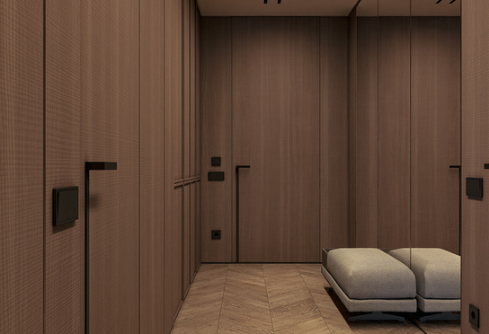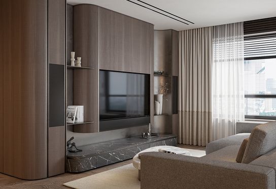 Дизайн интерьера квартиры в тёмных тонах с использованием натурального дерева — именно так выглядит этот проект. Массив дерева задаёт характер каждого пространства: тёплая текстура материала контрастирует с глубокими тёмными оттенками стен и мебели, создавая уютную и выразительную атмосферу. Заказчики хотели современный интерьер без лишних деталей — с чётким зонированием и продуманной функциональностью. В результате получилось пространство, где дерево — не просто отделка, а полноценный архитектурный элемент, подчёркивающий форму и структуру интерьера.
