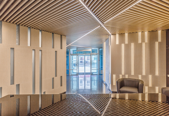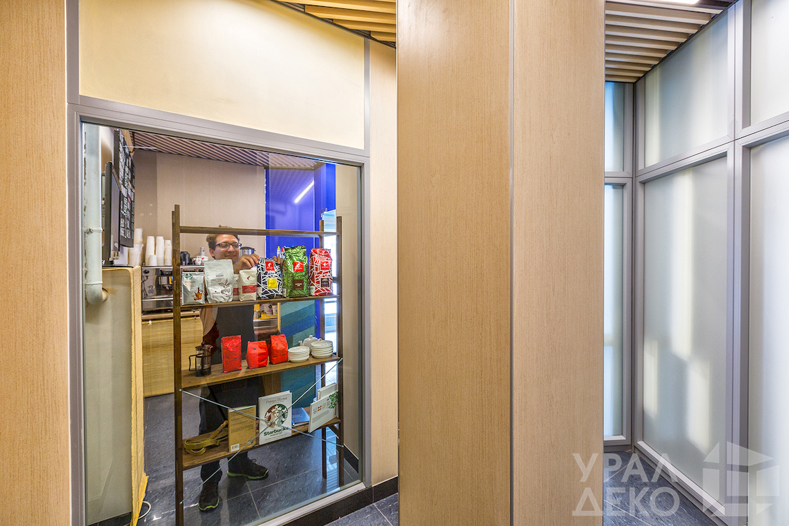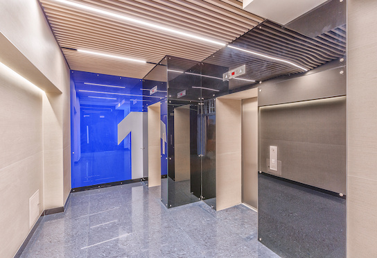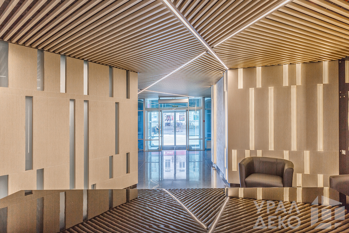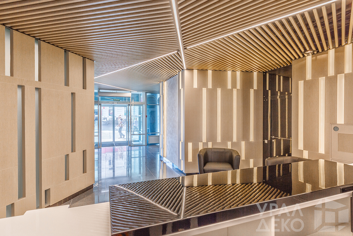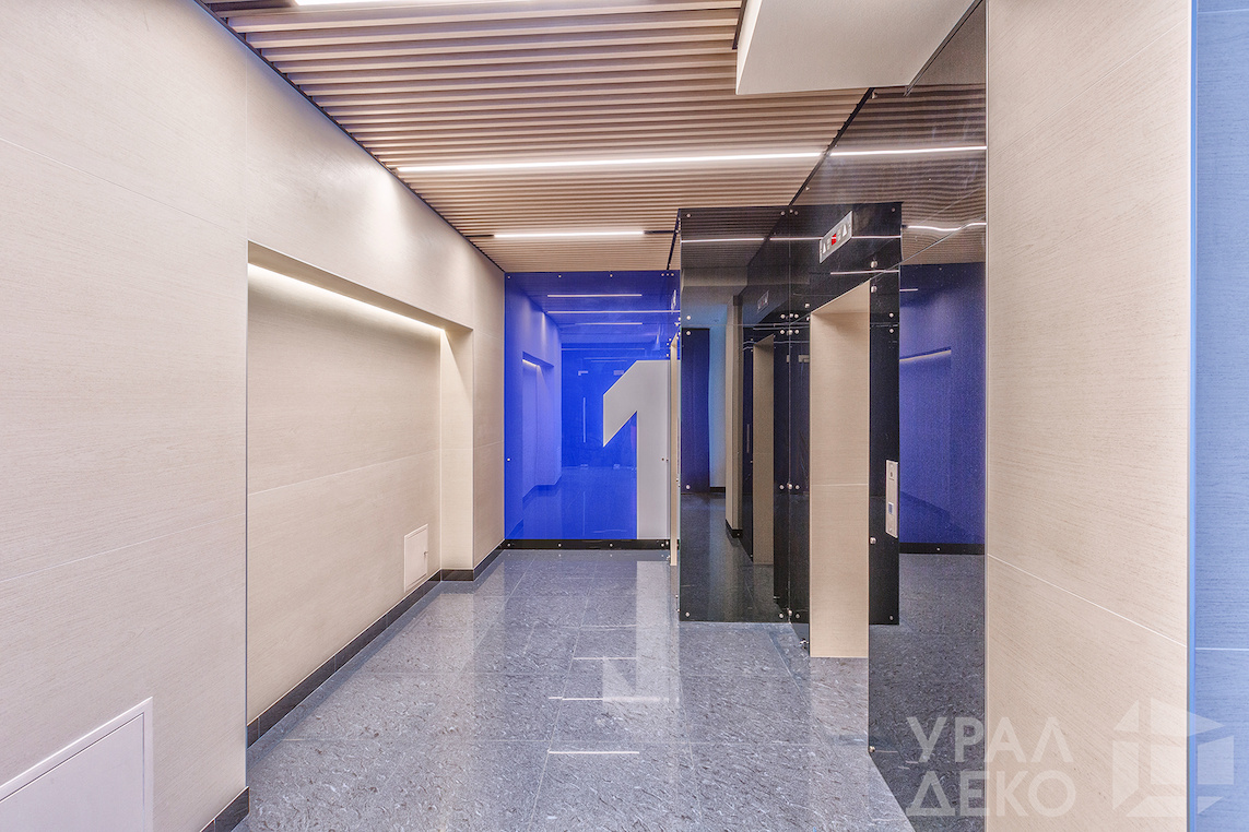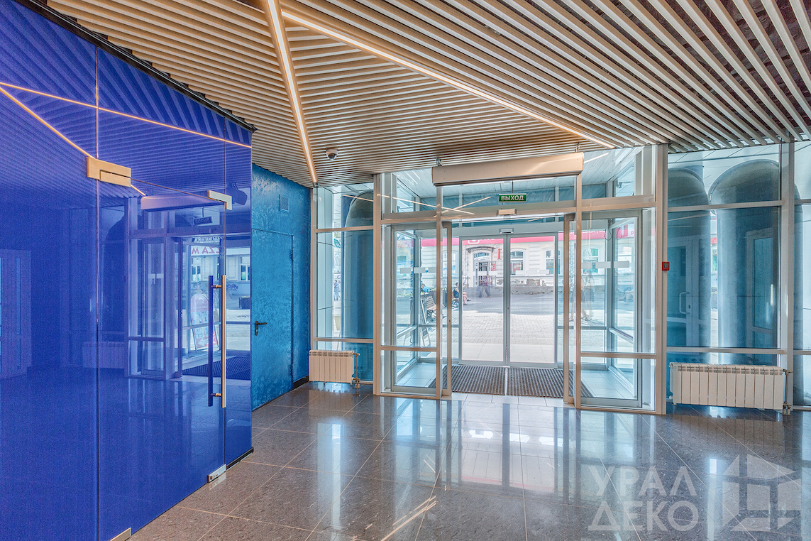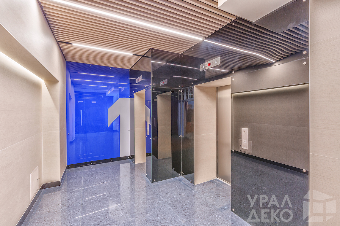 Глянцевые стеклянные поверхности перегородок, матовые деревянные фактуры, стены, облицованные тонкослойным керамогранитом, декоративные покрытия насыщенных морских тонов, кубообразные геометрические потолки с линейным диодным освещением – все это вызывает ощущение восторга у посетителей и арендаторов, по достоинству оценивших результаты ремонта бизнес-центра.